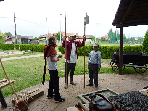 Rycerze św. Franciszka z Podlesia wybrali się na spotkanie z Rycerzem do MDK Zarzecze. RYCERZEM był Tomasz Świdergał, dyrektor Gimnazjum nr 19 w Katowicach, nauczyciel historii. Pięknie opowiadał o Rycerzach. Patronem Rycerzy jest św. Jerzy i św. Jadwiga księżna. Rycerz posiadał tarczę z herbem po którym rozpoznawał przeciwnika. Rycerz ze Śląska posiadałby tarczę w kolorze niebieskim i żółty. W herbie śląska znajduje się żółty orzeł na niebieskim tle bez korony. Poznaliśmy niektóre części ubioru rycerza. Przymierzaliśmy: szaferon (czapkę), napotek, kaptur, bobaskę, przyszywanicę itd . Można było na siebie włożyć kolczugę. Jako ochrona rycerzowi służyła tarcza, hełm, zbroj. Przekonaliśmy się, jak dużo pracy miał z nałożeniem reszty elementów zbroi, pomagał mu w tym giermek (ten musiał także dbać o czyszczenie zbroi i broni by nie zardzewiała). Do ekwipunku rycerza (który dźwigał na koniu), trzeba dołożyć garnuszek (dzisiejsza menażka), kufel, gwizdek, krzesiwo by rozkrzesać iskrę pod ognisko lub do zapalenia lontu a potem ładunku strzelającego – prochu. Podczas walki posługiwał się kopią służącą do przebijania zbroi. Rycerz posiadał miecz, topór lub inny przedmiot którym walczył. Przy pasie nosił zawsze mizerykordie, czyli mały niewielki sztylet służący do zadawania śmiertelnych ciosów. Pan Tomasz wyjaśniał nam jak bronią posługiwał się rycerz, zademonstrował hakownicę – dwa razy wystrzelił z niej. Pokazał nam kiścień, topór, noże, miecze, halabardy. Potem przyszedł czas na turniej. Podzieliliśmy się na dwie drużyny giermka Adama i giermka Mateusza. Było przeciąganie liny, po omacku trafianie halabardą w balon, wyścigi na deskach,walka bezpośrednia (tu dziewczyny zaprezentowały waleczność i pomysłowość), wyścigi w chodzeniu po tarczach a na koniec konkurs odpowiedzi na pytania. Zwycięscą została drużyna giermka Adama (14:11), chociaż walka była bardzo wyrównana. Turniej udany i humory dopisały. Niektórzy planują następne spotkanie. Na wieży kościelnej rozdzwoniły się dzwony, zrobiliśmy przerwę. Rycerze z Podlesia zaprosili do modlitwy Anioł Pański. Na koniec „wieczny odpoczynek……..” za tych wszystkich poległych Rycerzy, wojowników żołnierzy poległych w czasie bitew. Dziękujemy PanuTomaszowi za tę lekcję historii.