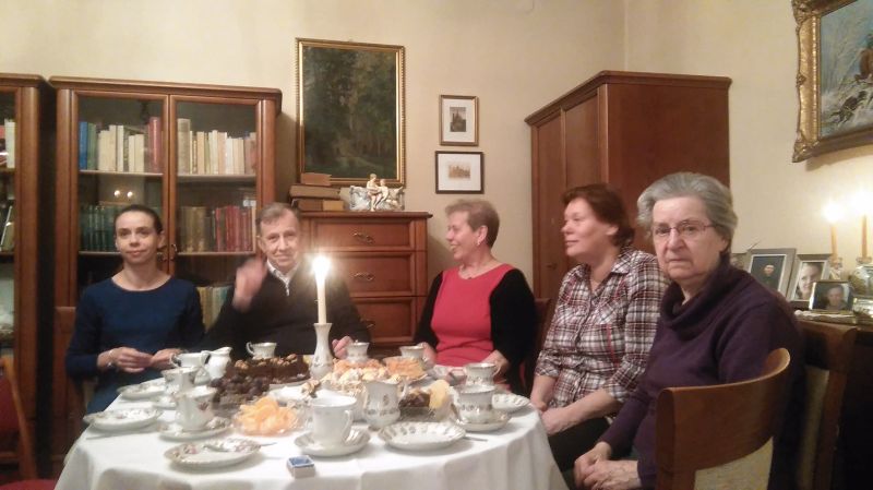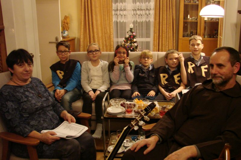 Po raz trzeci jedziemy do s.Zofii Haśnik śpiewać kolędy. Sześciu Rycerzy z s.Leokadią i br.Zbigniewem Kołodziejczykiem OFMCap. Jesteśmy ciepło przywitani przez cała rodzinę. Rycerze na powitanie br.Zbigniewowi zaśpiewali „Sto lat” bo to dzień Jego urodzin. Poznaliśmy najmłodsze pokolenie. Jak ostatnio dostaliśmy trójkąty,kastaniety, dzwonki …Zrobiło się radośnie. Czuliśmy się dziećmi O.Sylwestra. Pan Karol grał na pianinie, s.Basia i br Zbigniew na gitarze.
